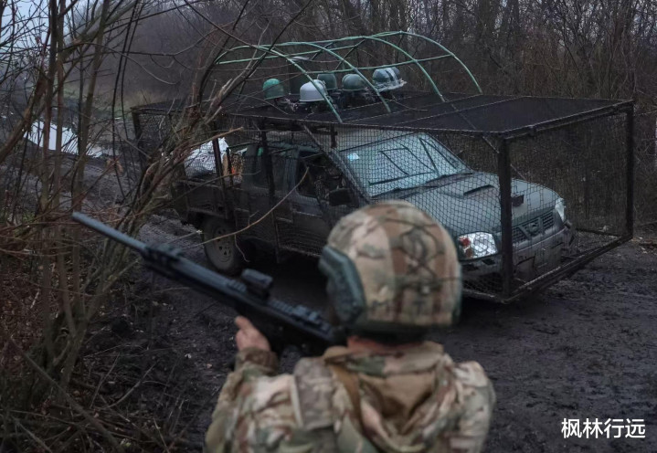 乌克兰陆军后勤——带有防护笼的轻型货车、配备干扰装置的ATV、无人机、霰弹枪、网状道路设施……
